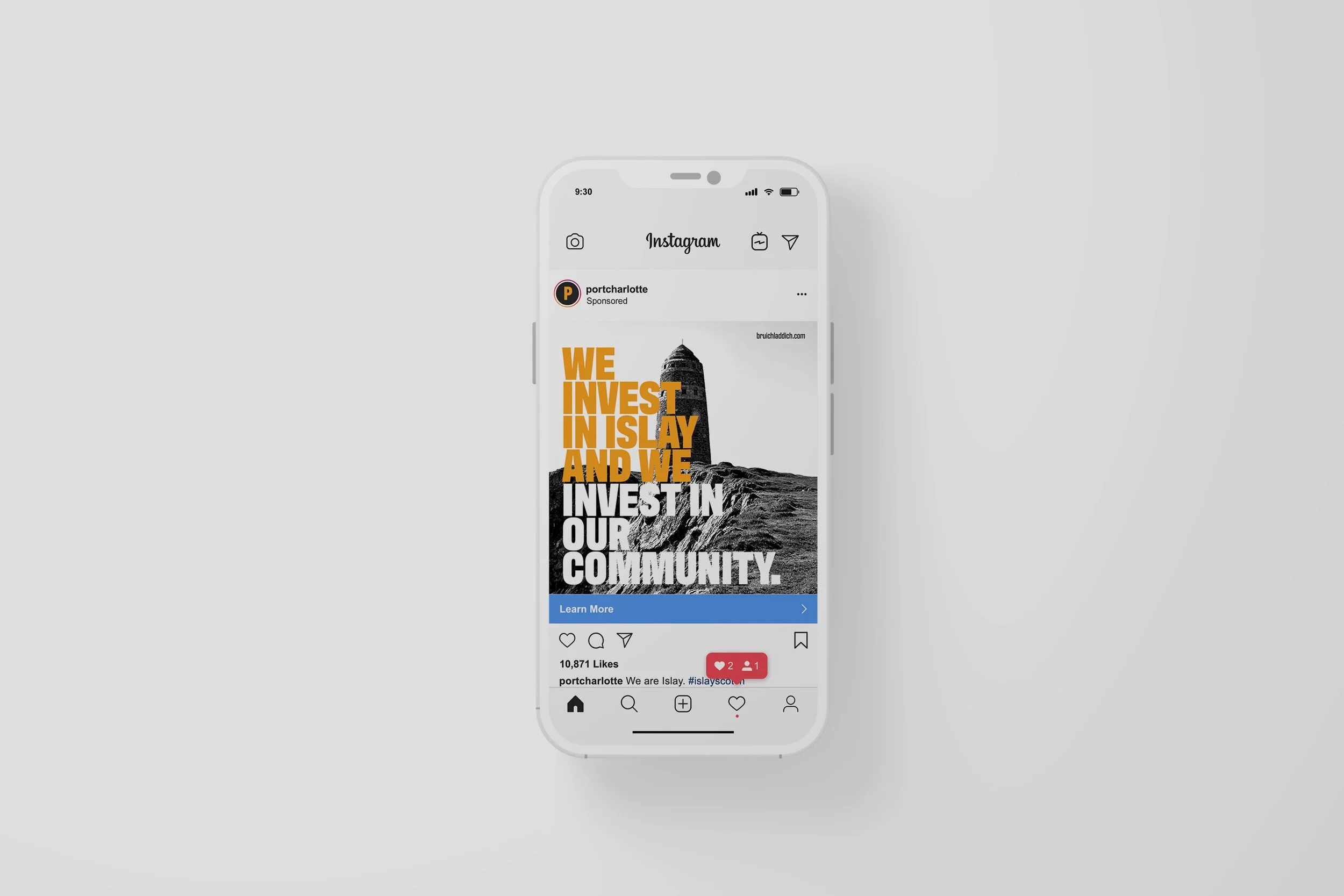 The typography throughout the campaign is a bold san-serif font that takes up a lot of the space on each layout. The leading is very small as well, creating a wall of text. This emulates the Port Charlotte branding and text treatment on the packaging. Creating a block of text particularly in the Instagram ads uses symmetry to establish a connection between the words and the subject of the photography.