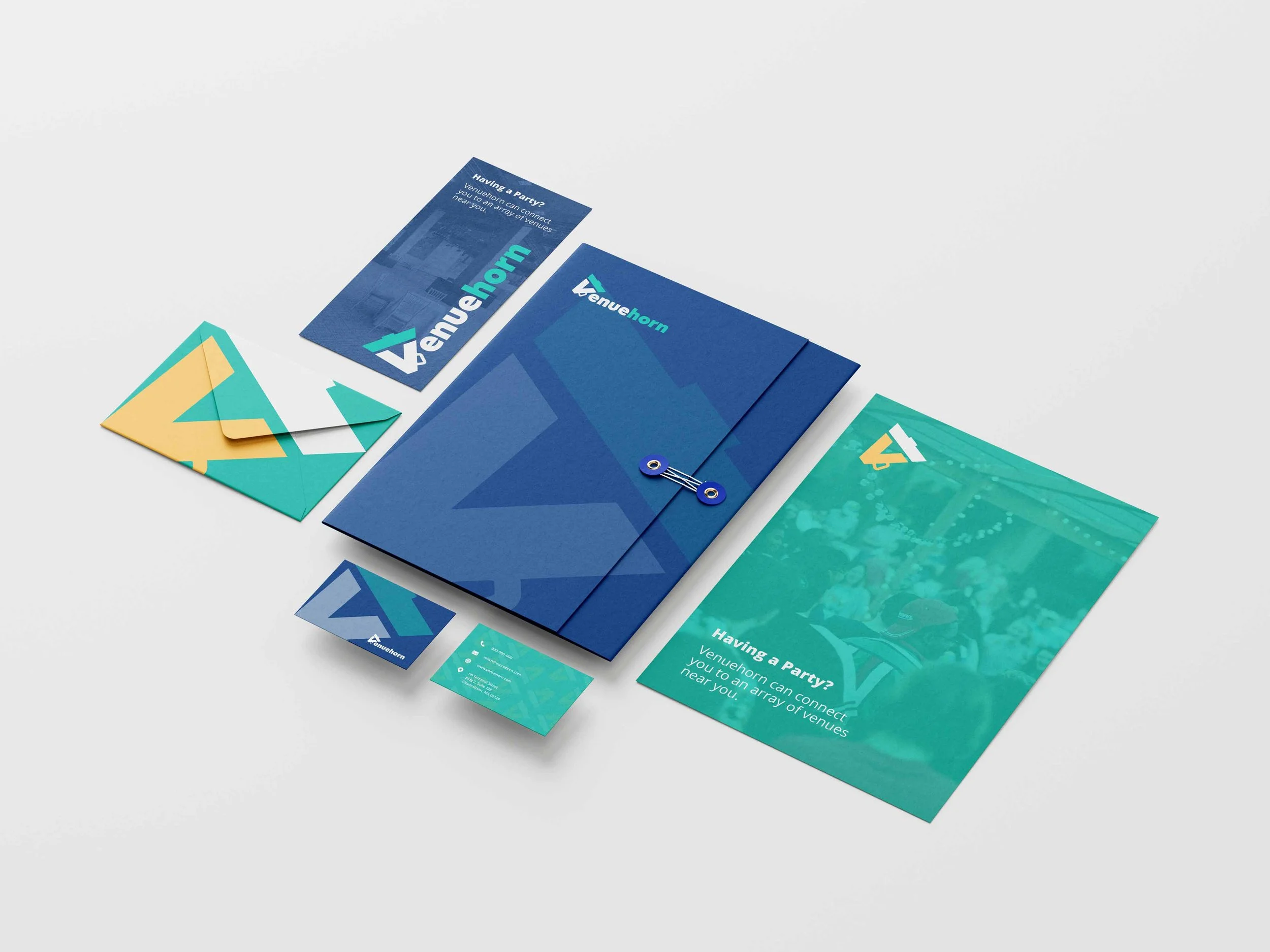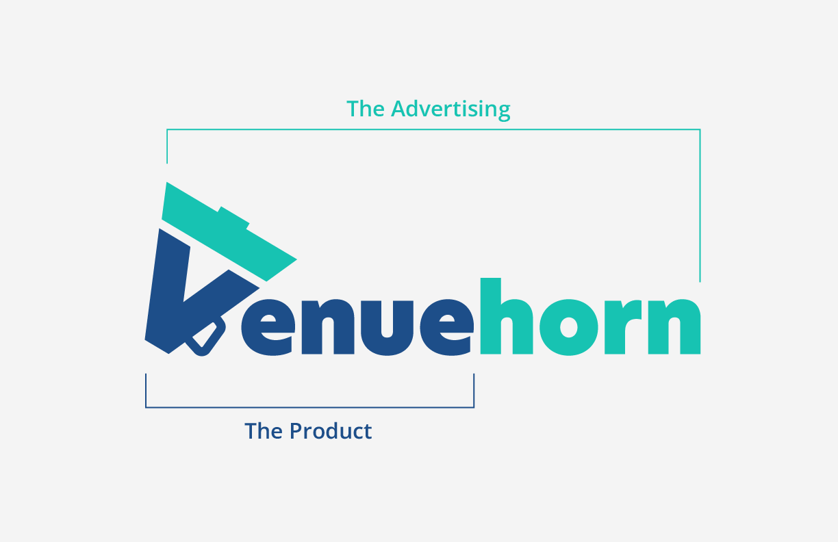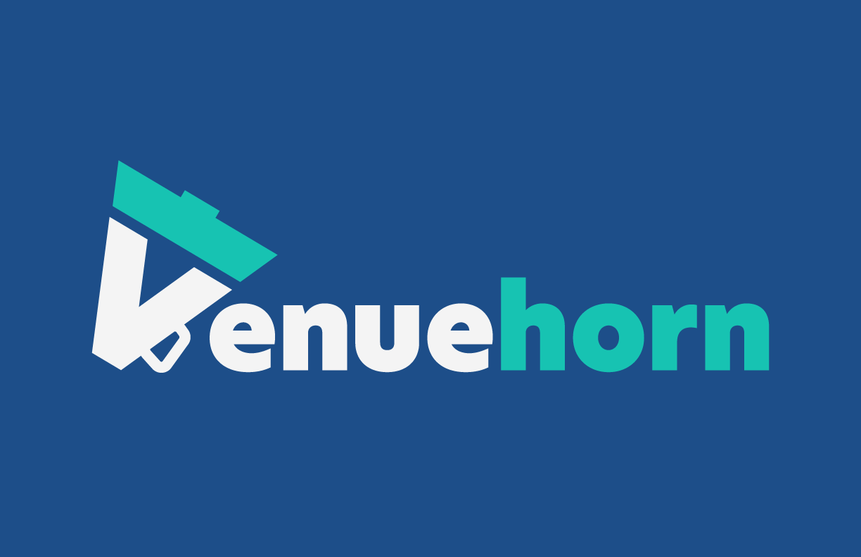 The logo is visually broken up into two words, “venue” and “horn” to emphasize the product and service. “Venues” are the product that the company provides for individuals and organizations. “Horn” is the advertisement of available rental spaces, akin to shouting through a bullhorn, which is why the “v” doubles as a bullhorn. This service provides landlords with exposure.